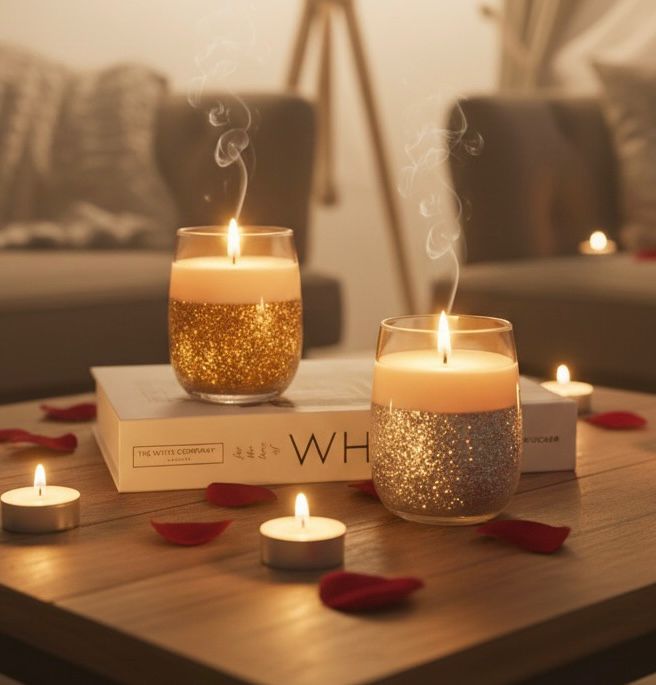 Elevate your evening with the soft, seductive flicker of our glitter-accented candle. Its delicate glow and long-lasting aroma create an atmosphere of pure romance, making any moment feel like a special occasion.