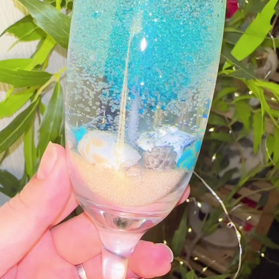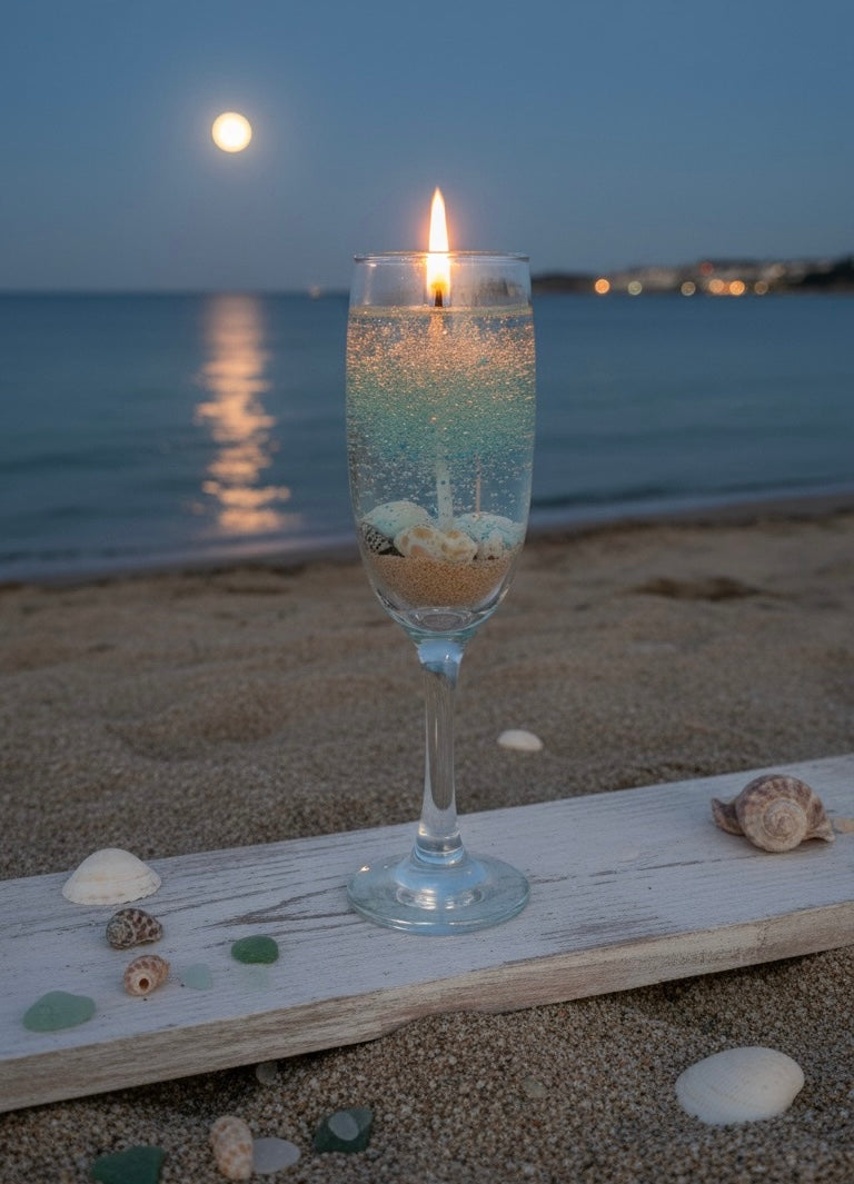 Transport yourself to a moonlit shore with our Ocean Breeze Champagne Candle. Elegantly crafted in a premium champagne flute, this candle captures the magic of the sea with its stunning gradient of crystalline blues and sandy textures. Featuring real embedded seashells, it is more than just a candleโ€”itโ€™s a piece of coastal art.